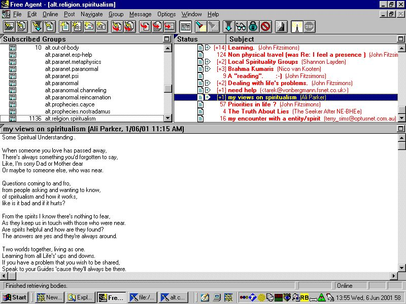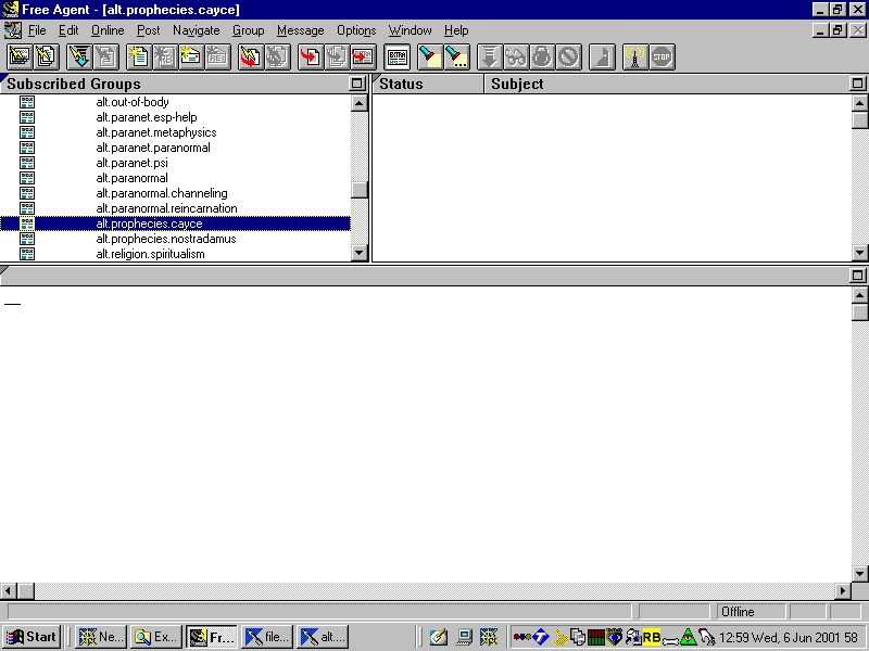 Now go to EDIT - find and put in whatever subject that interests you eg. "paranormal". If you want to see messages in a particular newsgroup then once you have it's name highlighted you go GROUP - Subscribe or click the subscribe button on the toolbar. Otherwise, ignore the highlighted group name. Continue with "find next" until you are told that there are no more newsgroups with that word in. Repeat the process for any other words/topics that interest you.
